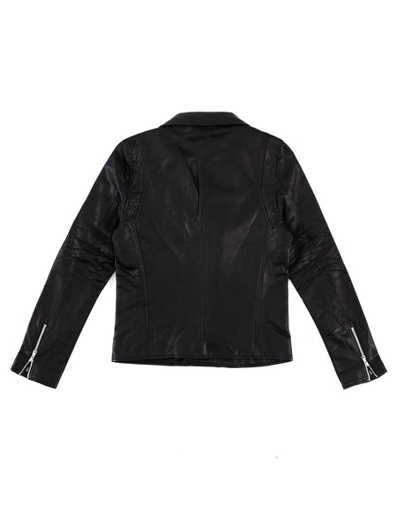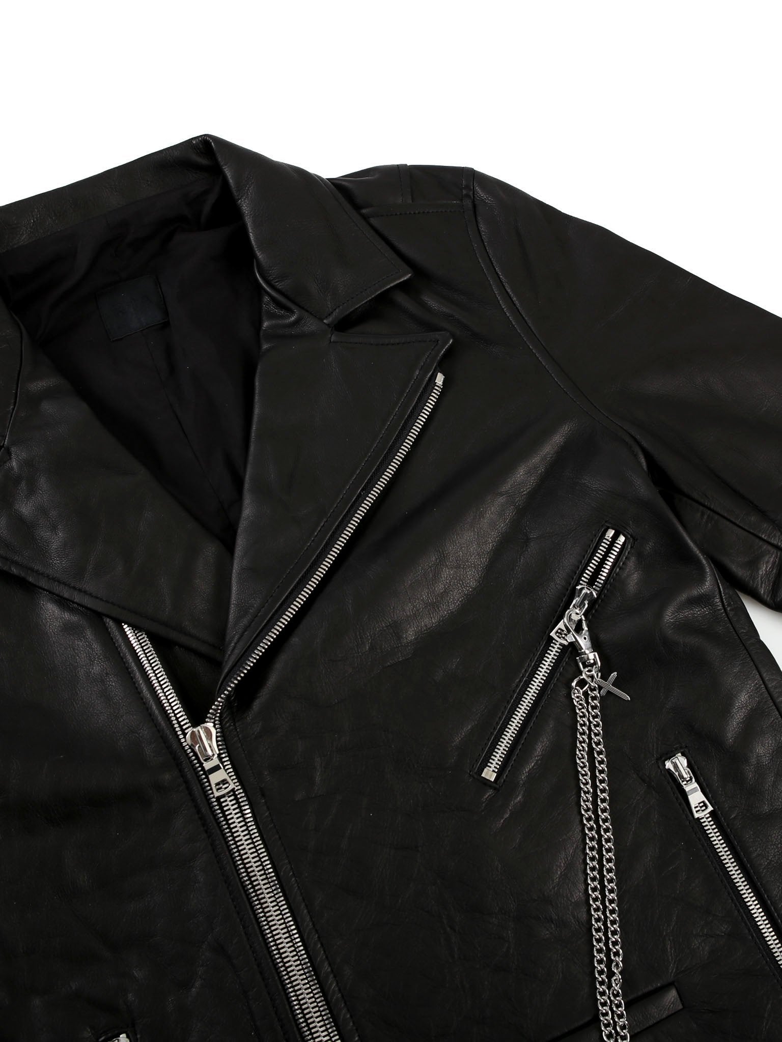 - Peak lapels, welt pocket and three zip pockets at front, gusseted zip cuffs, center seam at back, polished silvertone hardware